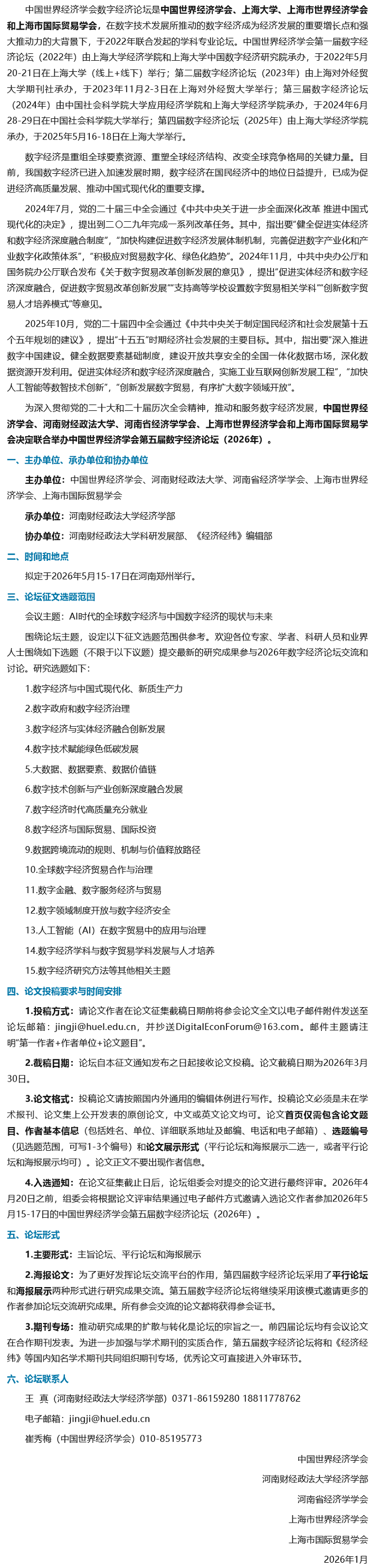 中国世界经济学会第五届数字经济论坛(2026年)征文通知