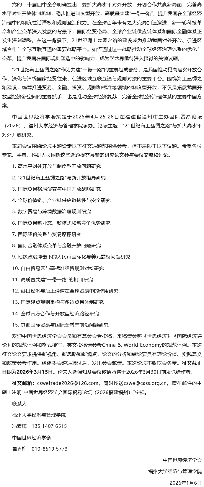 中国世界经济学会国际贸易论坛(2026)征文通知